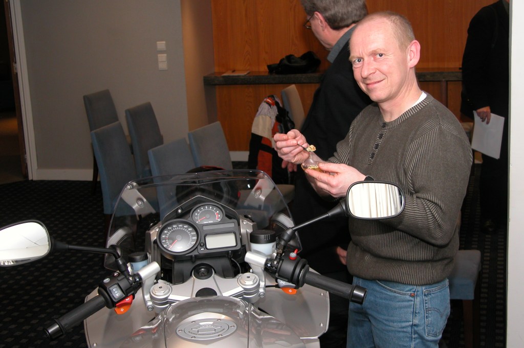 Det er R1200RT også. De første 15 milene av kjøringen går i marsjfart rundt 120 km/t i minusgrader. I full komfort.