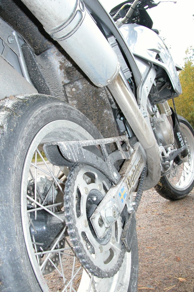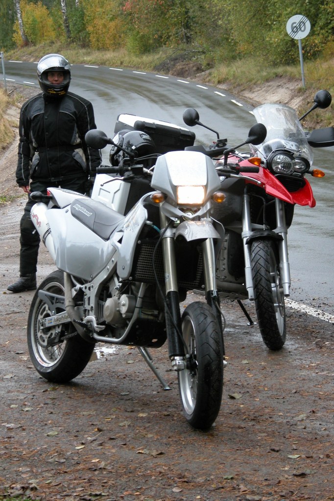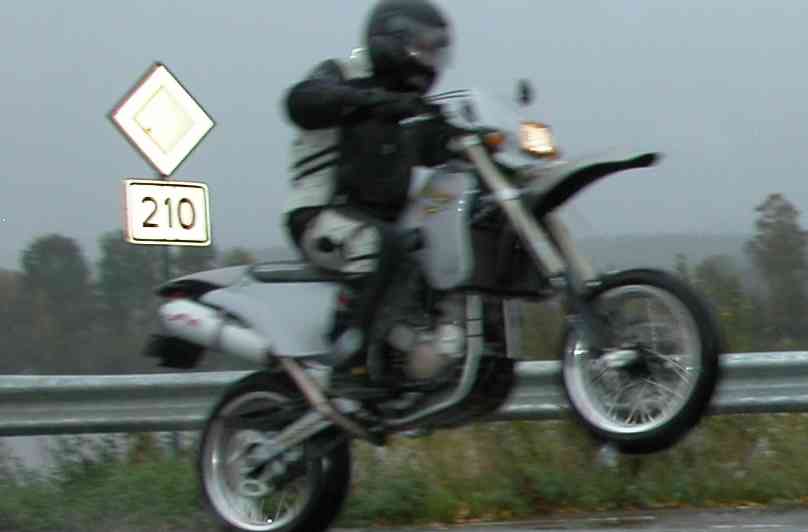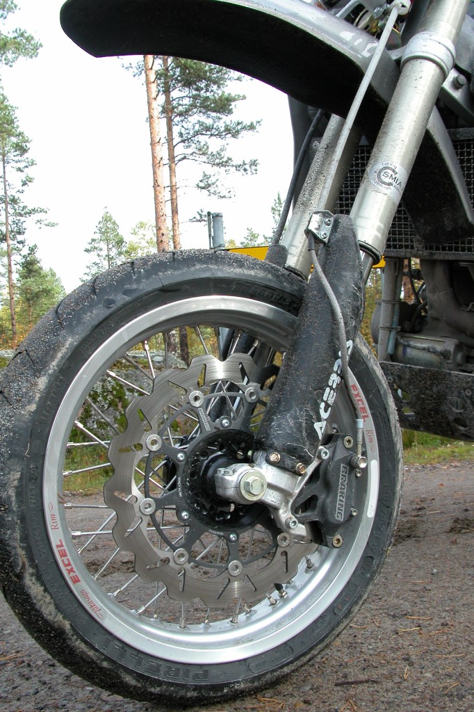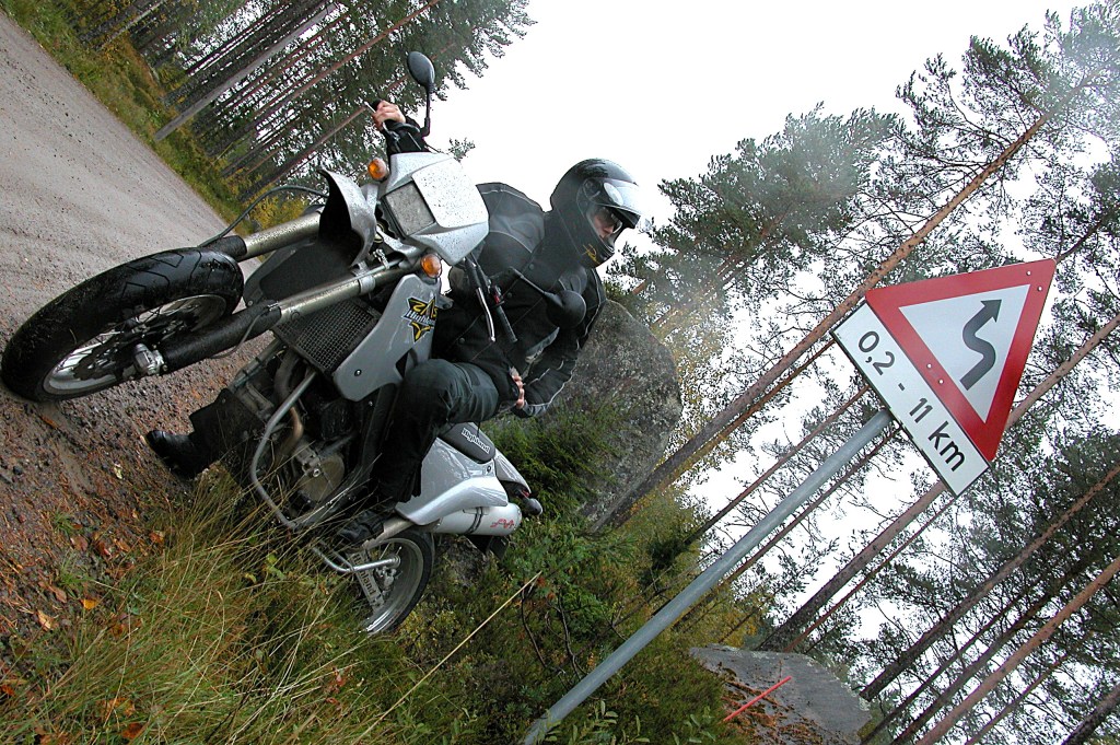 Hele sykkelen er lett, med oppgitte 165 kilo tørrvekt. Og chassiset er førsteklasses, med fulljusterbare WP-dempere. Ute på våte, småglatte veier tar det litt tid å stole på Pirelli-dekkene, men de sitter som limt også på våt asfalt. Deretter er det på bakhjulet over alt.