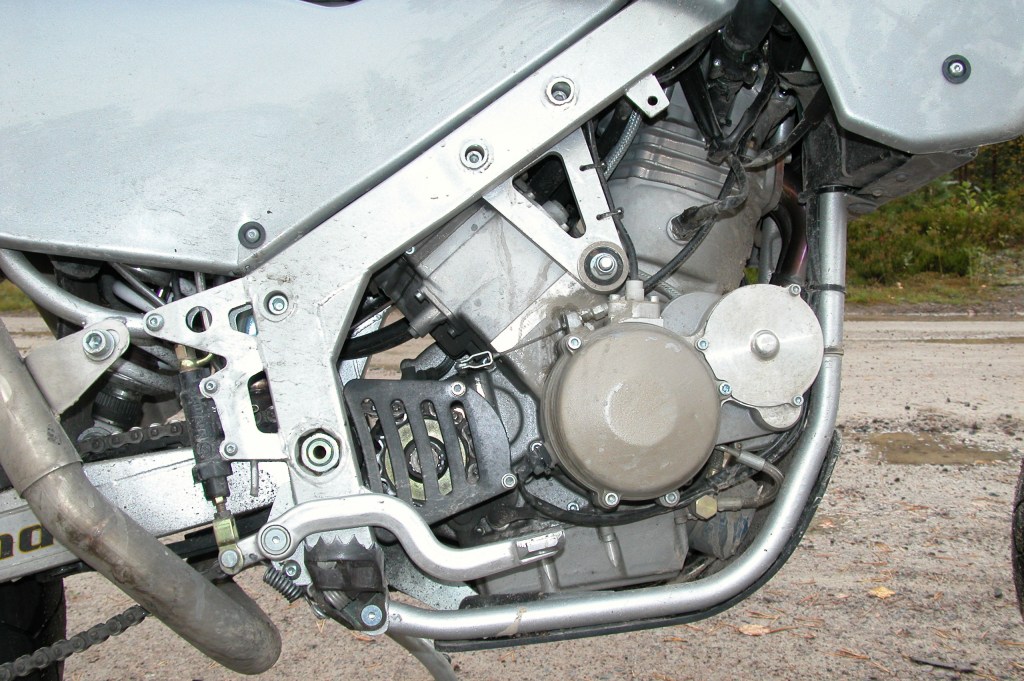 Highland har jobbet i ganske mange år med å få til denne ultralette, smale V-twinnen på 936 kubikk. Utgangspunktet var to ensylindrede motocrossmotorer koblet sammen. 2004-utgaven vi kjører er omsider blitt både noenlunde sivilisert hva angår vibrasjoner og levetid.